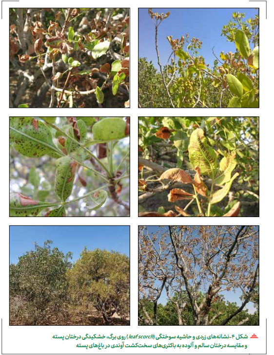 نشانههای بیماری در درختان پسته بهصورت زردی و سوختگی پهنک و حاشیه برگها روی یک یا تعدادی از شاخههای درختان بوده که با پیشرفت بیماری، حاشیه سوختگی و کوچکشدن برگها، سر خشکیدگی و در نهایت مرگ درختان مبتلا نیز مشاهده میشود (شکل 4). علائم ناشی از عفونت X. fastidiosa غیراختصاصی و عمدتاً شبیه نشانههای تنش آبی است که شدت این نشانهها بسته به گونه میزبان، ژنوتیپ پاتوژن، شرایط محیطی و ارتباط میان باکتری و میزبان متفاوت است. گیاهان مایهزنی شده با X. fastidiosa برای مدت زمانی بدون علامت بیماری باقی میمانند که این زمان بسیار متنوع است، از 12 ماه در پیرس انگور تا 14 ماه در بیماری زوال سریع زیتون که این زمان بستگی به تنشهای زنده و غیرزندهای دارد که گیاه مایهزنی شده با آن روبرو میشود.